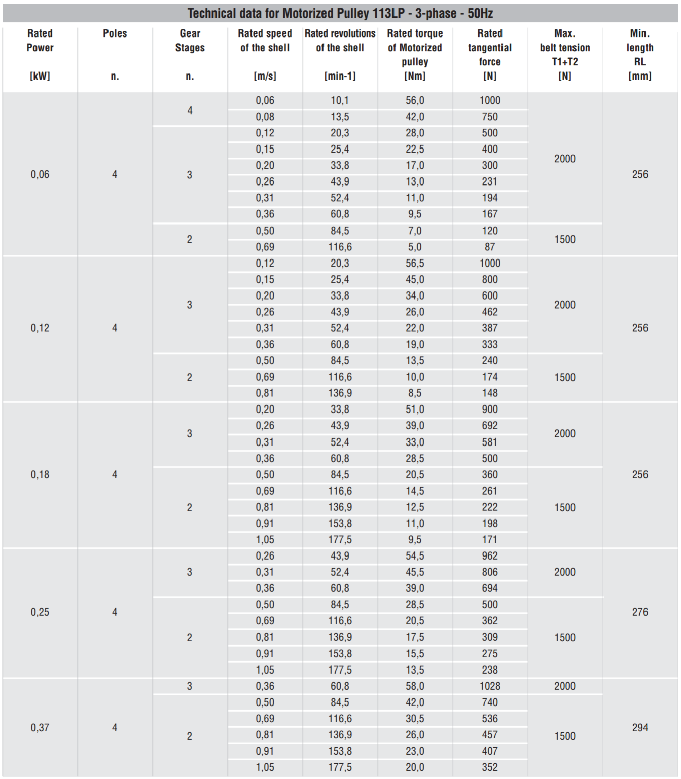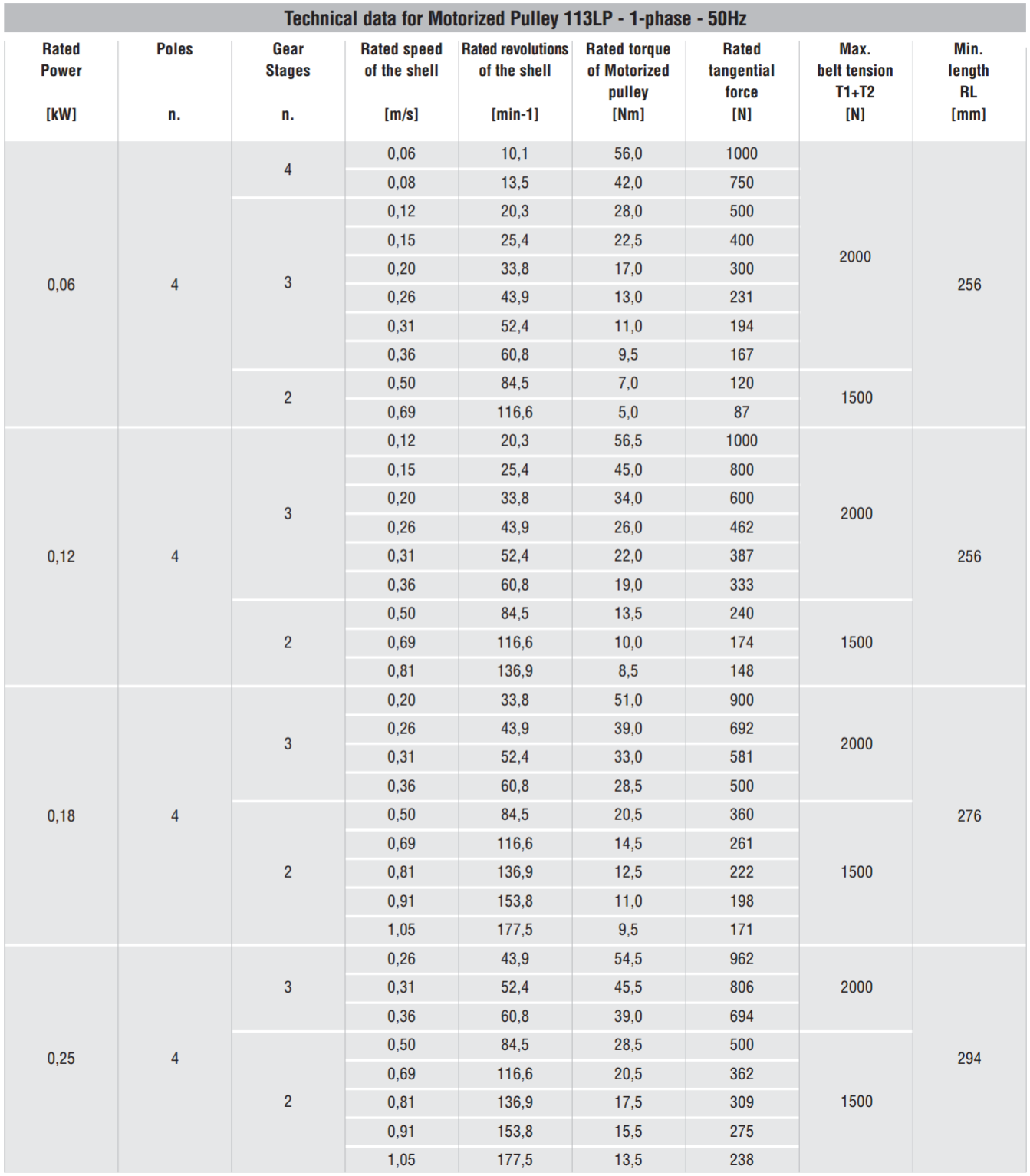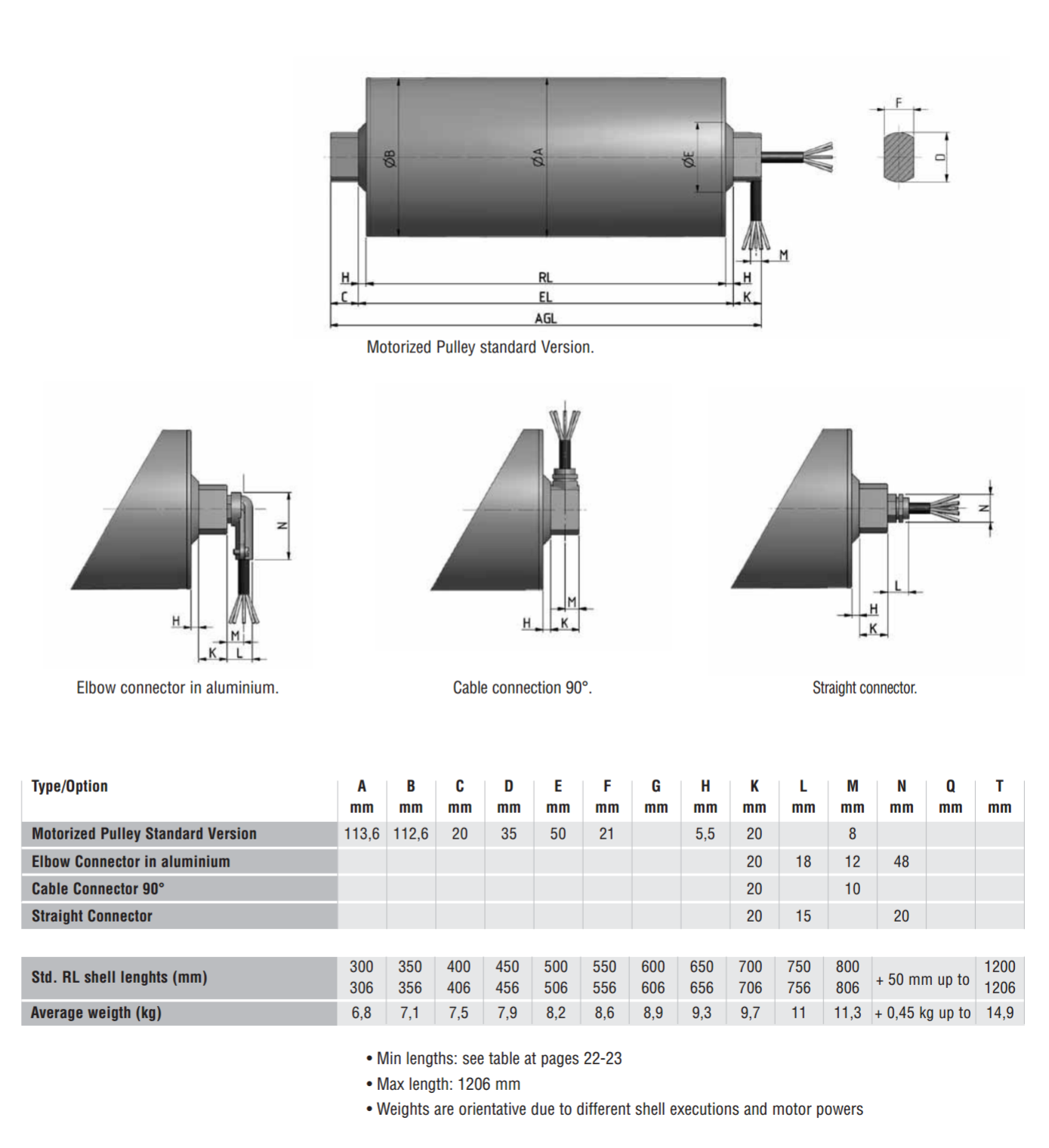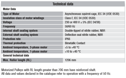 Motorized Pulleys with RL length greater than 706 mm have reinforced shaft. All data and values declared in the catalogue refer to operation with a frequency of 50 Hz.